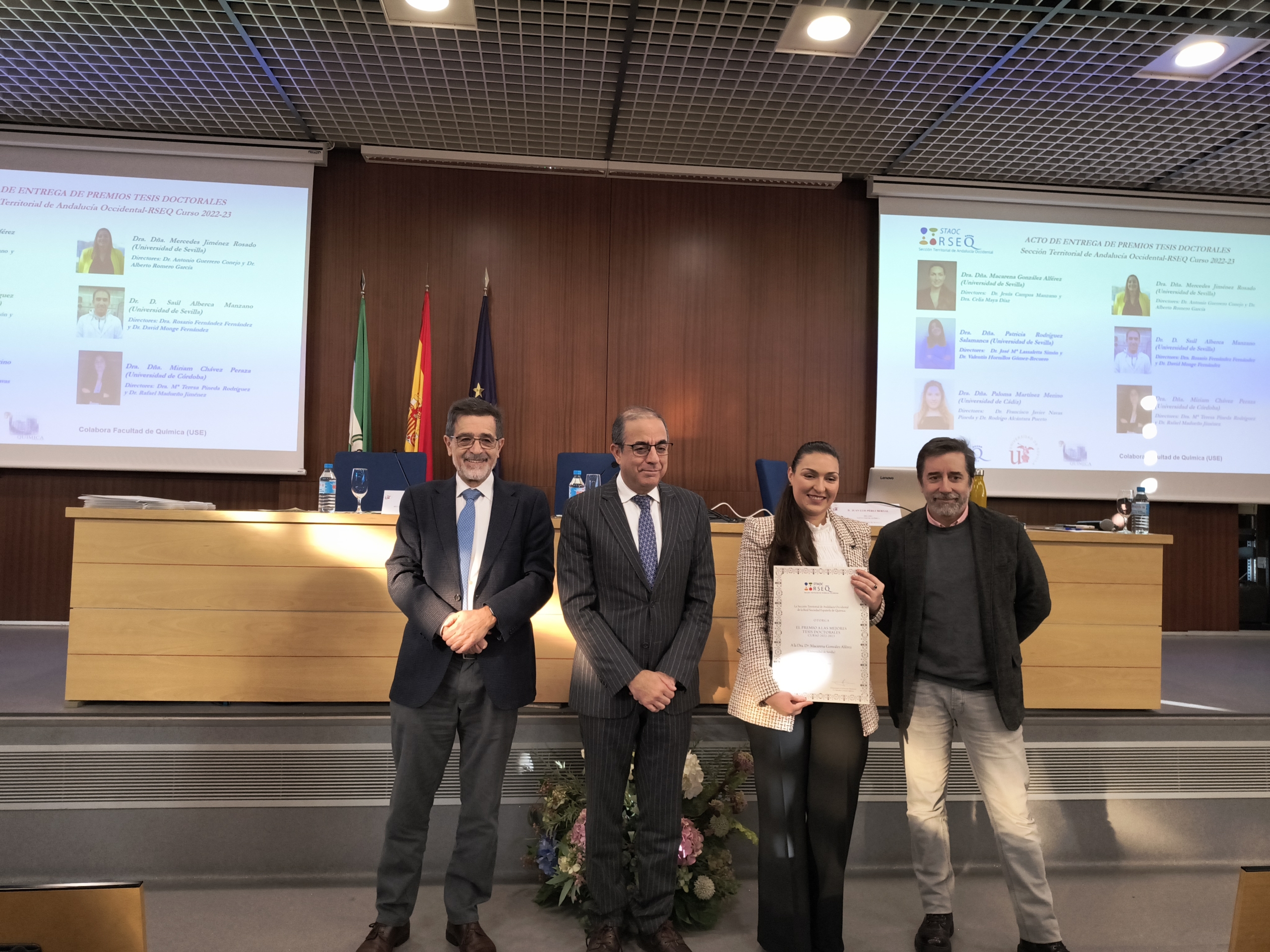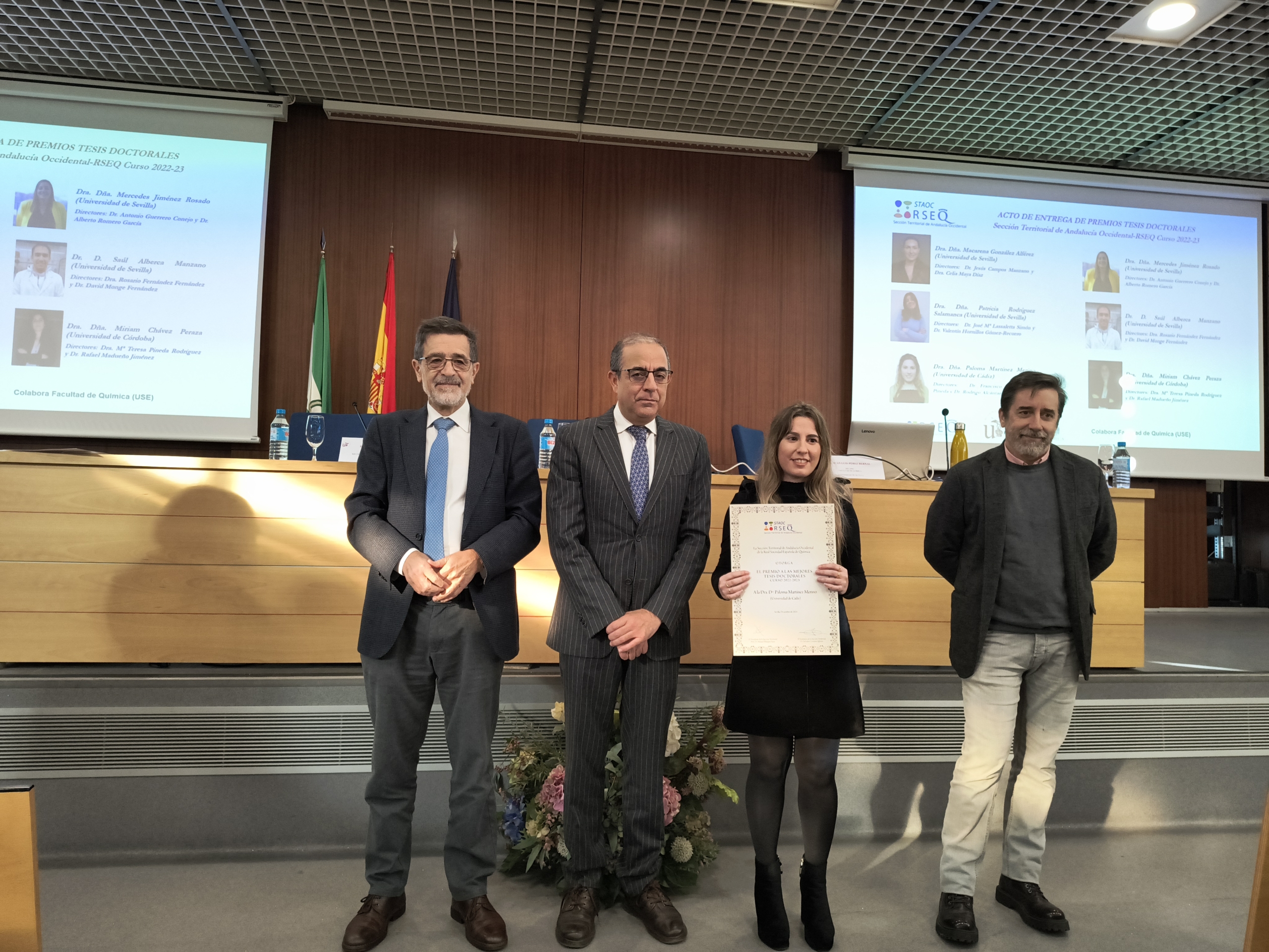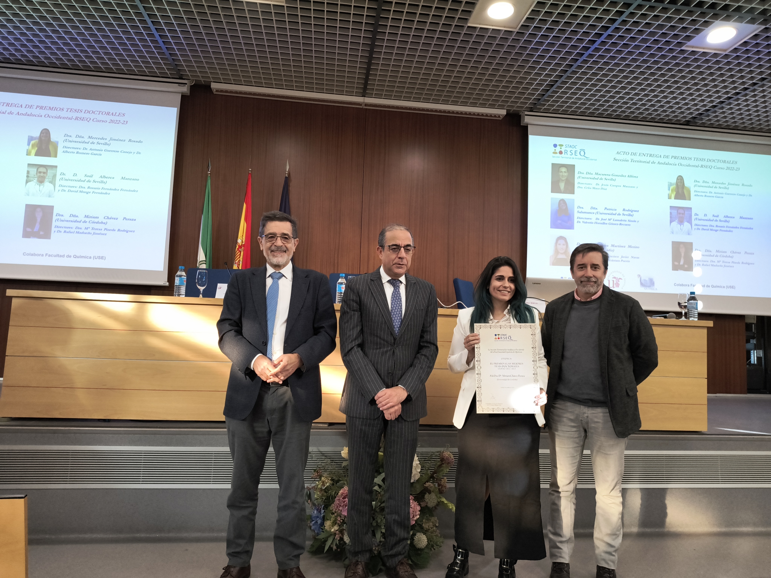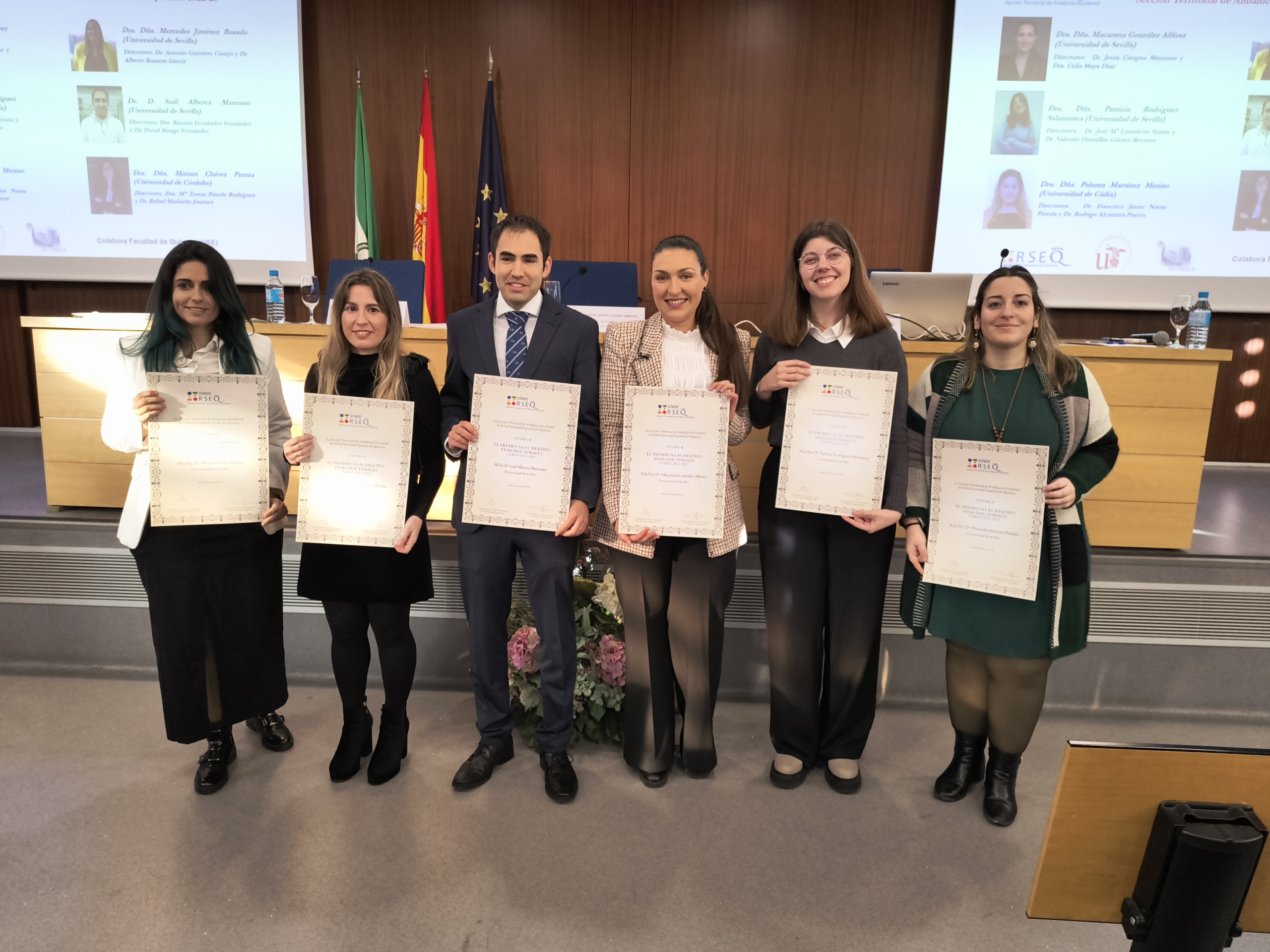 El pasado 13 de diciembre de 2024 tuvo lugar el Acto de entrega de Premios a las Mejores Tesis Doctorales del curso 2022-2023 en la Facultad de Química de la Universidad de Sevilla. El acto contó con la presencia del Presidente de la Real Sociedad Española de Química, el Prof. Agustí Lledós, que impartió la conferencia “Los Sims van al laboratorio”, con el Excmo. Sr. Rector de la Universidad de Sevilla D. Miguel Ángel Castro Arroyo y con D. Juan Luis Pérez Bernal, Decano de la Facultad de Química de la misma universidad.