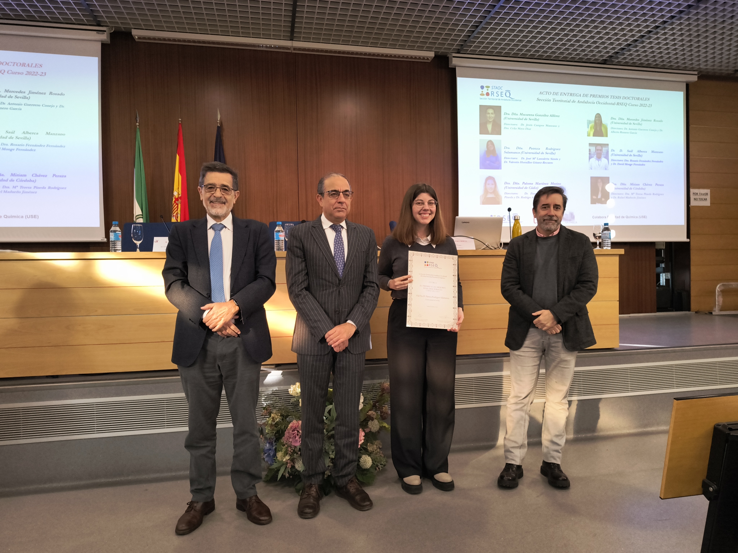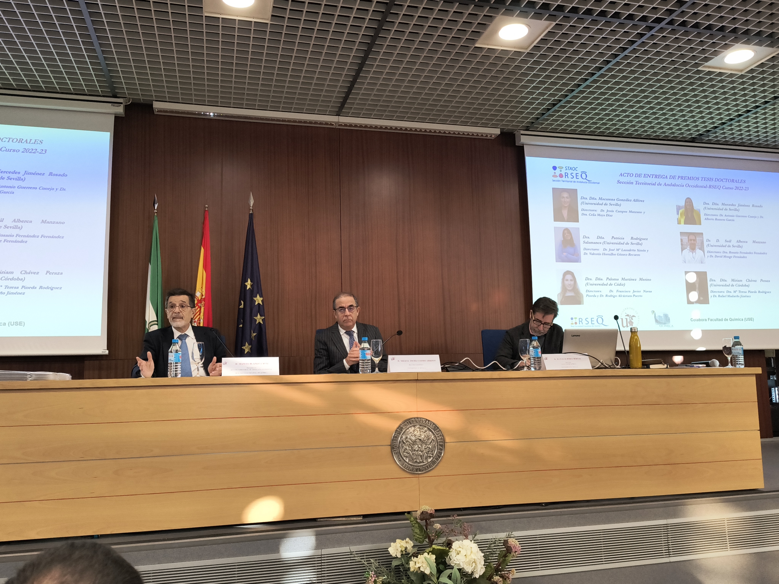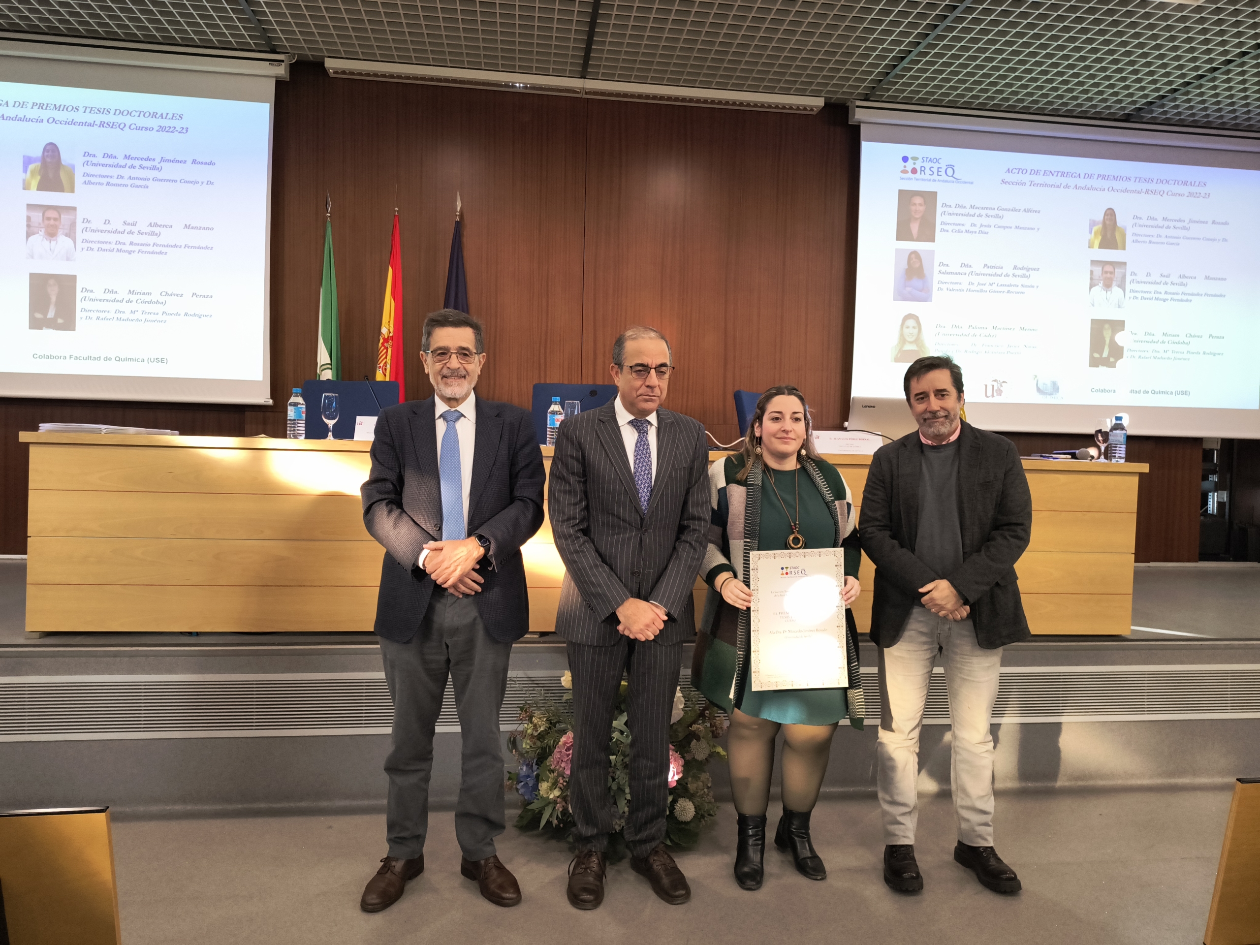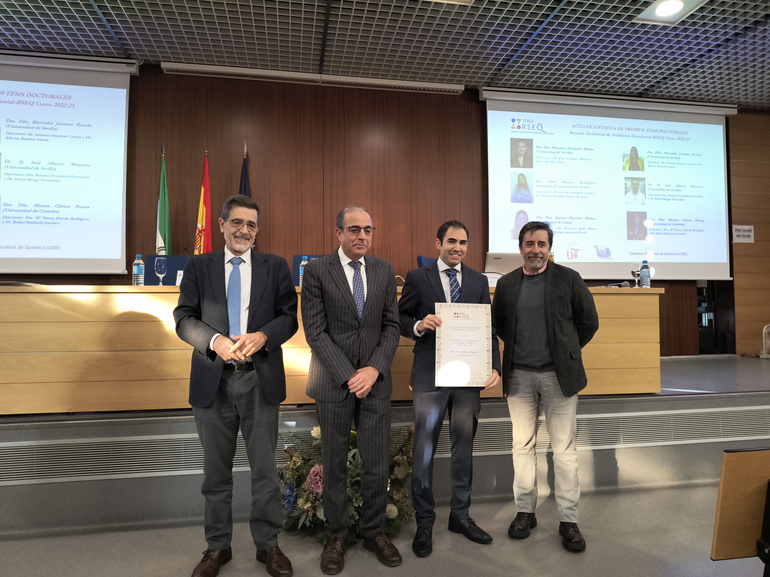 El pasado 13 de diciembre de 2024 tuvo lugar el Acto de entrega de Premios a las Mejores Tesis Doctorales del curso 2022-2023 en la Facultad de Química de la Universidad de Sevilla. El acto contó con la presencia del Presidente de la Real Sociedad Española de Química, el Prof. Agustí Lledós, que impartió la conferencia “Los Sims van al laboratorio”, con el Excmo. Sr. Rector de la Universidad de Sevilla D. Miguel Ángel Castro Arroyo y con D. Juan Luis Pérez Bernal, Decano de la Facultad de Química de la misma universidad.
