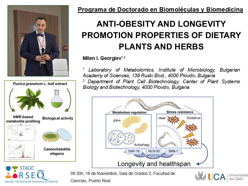 El próximo marte 18 de noviembre de 2025 el Prof. Milen I. Georgiev del Laboratory of Metabolomics, Institute of Microbiology (Plovdic, Bulgaria) impartirá la conferencia “Аnti-obesity and longevity promotion properties of dietary plants and herbs” en la Sala de Grados 2 de la Facultad de Ciencias de la Universidad de Cádiz (Puerto Real) las 9:30 h en el marco del 9º Congreso de Estudiantes de Doctorado.